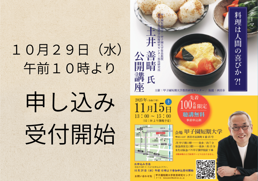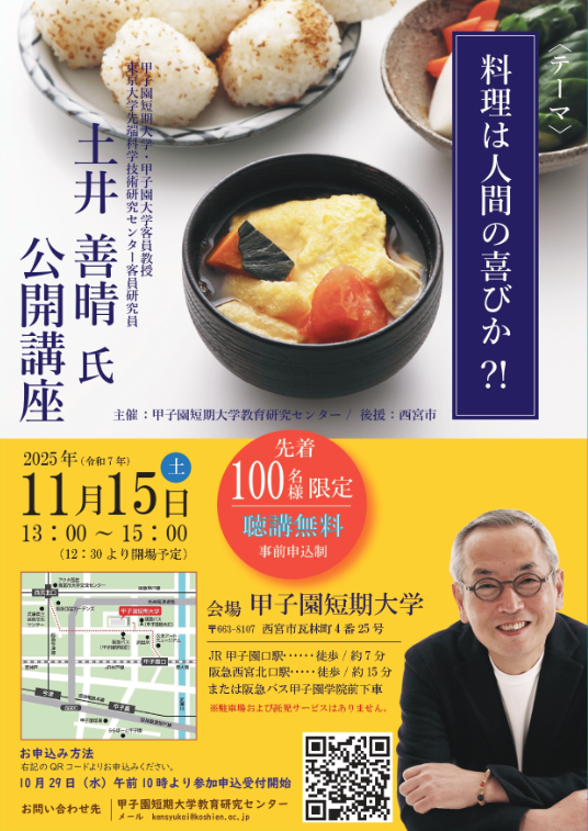 このたび甲子園短期大学教育研究センターでは、土井善晴先生(本学客員教授・東京大学先端科学技術研究センター客員研究員)を講師に迎え、公開講座「料理は人の喜びか?!」を開催いたします。
