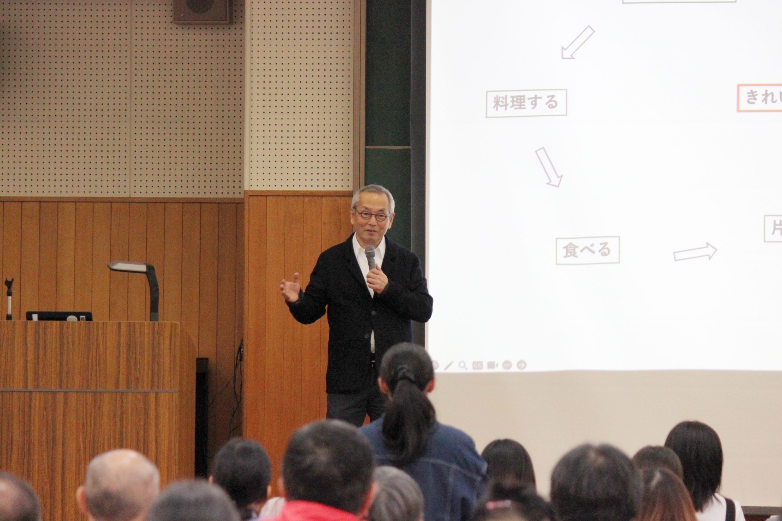 自然の恵みを大切に考えられている土井先生は、「日本の家庭料理は、自然の材料を集め、(素材そのものを生かし)料理し、食べる、そして、片づけてきれいにするこの循環を持続することが人の喜び、幸せにつながる」と、ユーモアを交えて話されました。