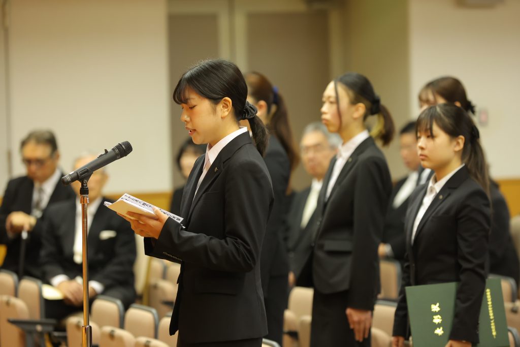 早坂学長から、本学で培った学びの姿勢と考え方の支柱である建学の精神に思いを巡らせ、誠実に努力をし、人との和と助け合いの気持ちを大切にして活躍してほしいとの式辞がありました。また、在学生からは共に重ねた各行事の思い出がたくさんつまった送辞が述べられました。それらを受けて卒業生代表からは、今までの学びや経験を活かし、また、共に励まし合ってきた友人達とのかけがえのない思い出、そして支えてくれた家族への感謝の気持ちを胸に、それぞれの場所でより一層の努力をしていくとの答辞がありました。